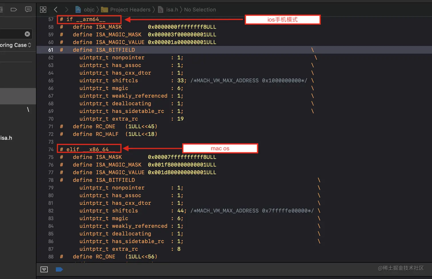 arm64中,ISA_MASK宏定义的值为0x0000000ffffffff8ULLx86_64中,ISA_MASK宏定义的值为0x00007ffffffffff8ULL