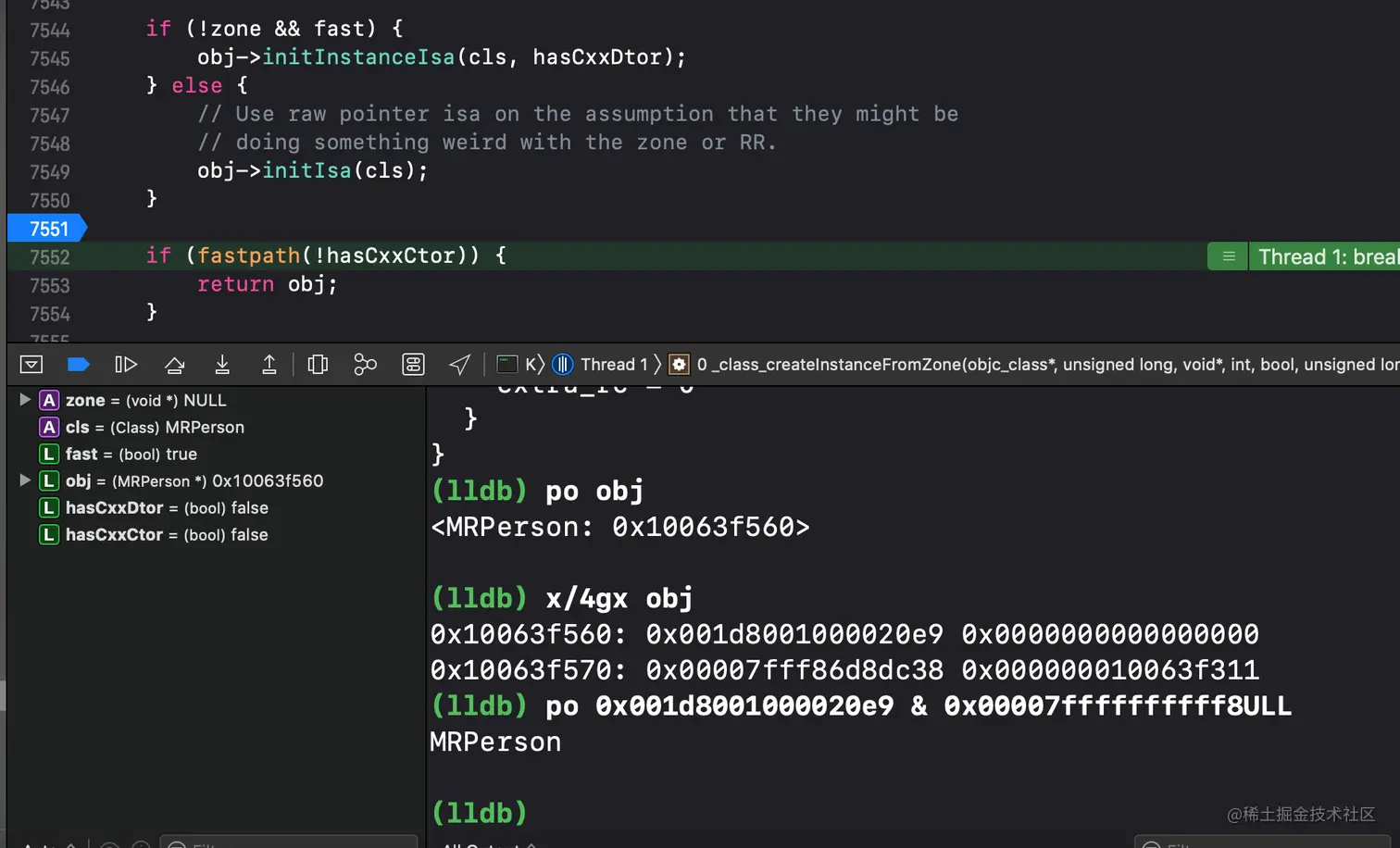 我们用源代码在这两行代码加入断点。确保调用传递进来的cls是我们要研究的MRPseron类运行至此时。在lldb做以下操作