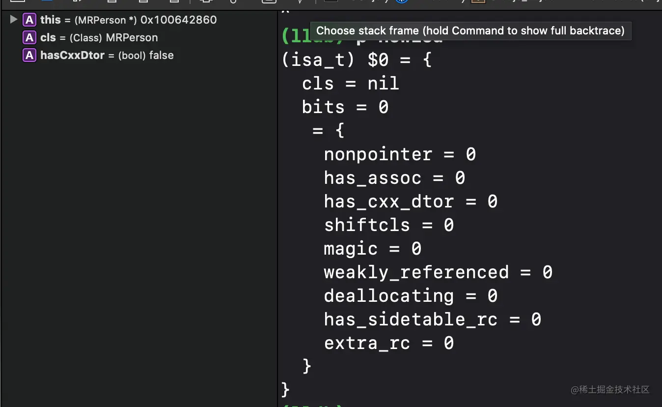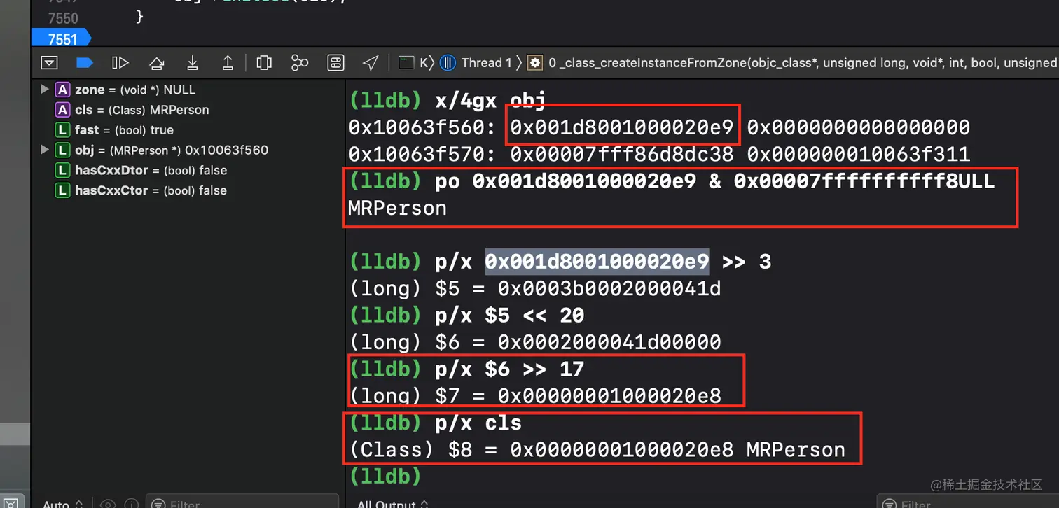执行**x/4gx obj**,得到isa指针的地址**0x001d8001000020e9,再将**isa**指针地址 & **ISA_MASK** (处于**macOS**,使用**x86_64**中的宏定义),即 po **0x001d8001000020e9**& 0x00007ffffffffff8ULL **得出**MRPerson**