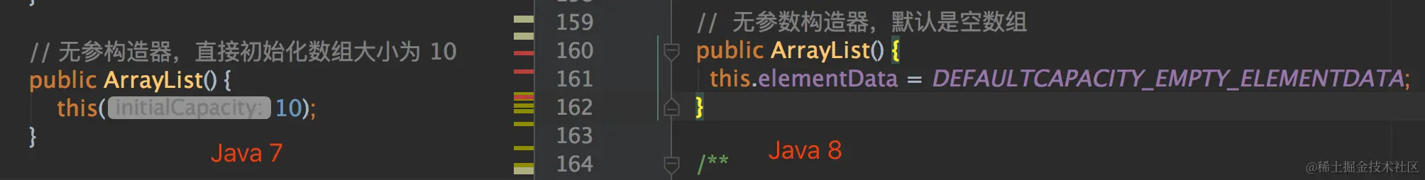 ArrayList 无参初始化时,Java 7 是直接初始化 10 的大小,Java 8 去掉了这个逻辑,初始化时是空数组,在第一次 add 时才开始按照 10 进行扩容,下图是源码的差异对比图:
