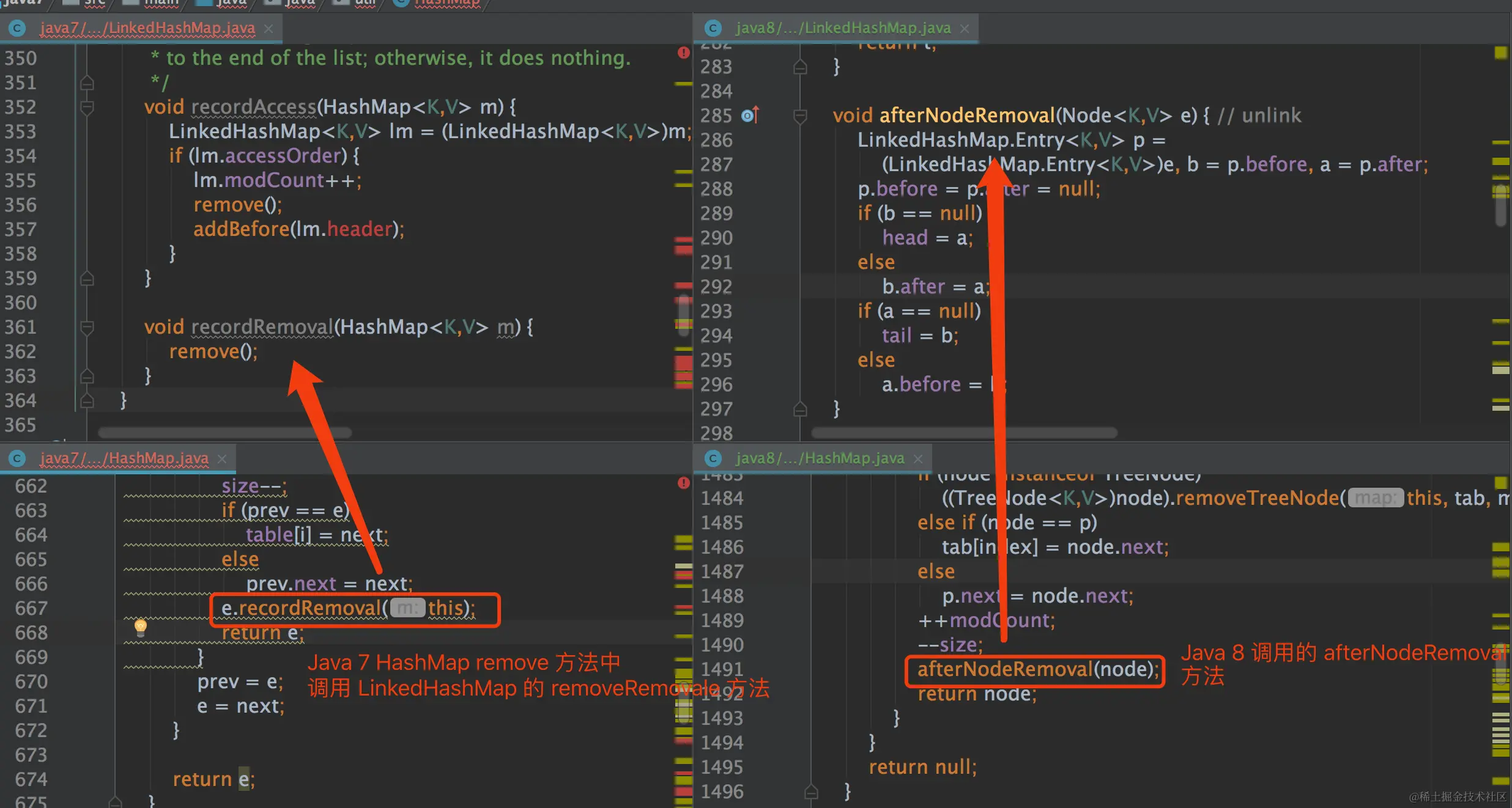 从图中,我们发现 LinkedHashMap 的方法名有所修改,底层的实现逻辑其实都差不多的。