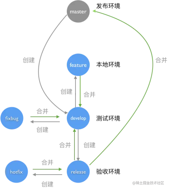 流程从develop建立功能分支feature,完成开发后push回develop进行测试,在develop建立测试服缺陷修复分支fixbug,完成测试环境验收后,在develop新建release分支作为验收环境的分支,验收完成并封版后合并到master和develop。