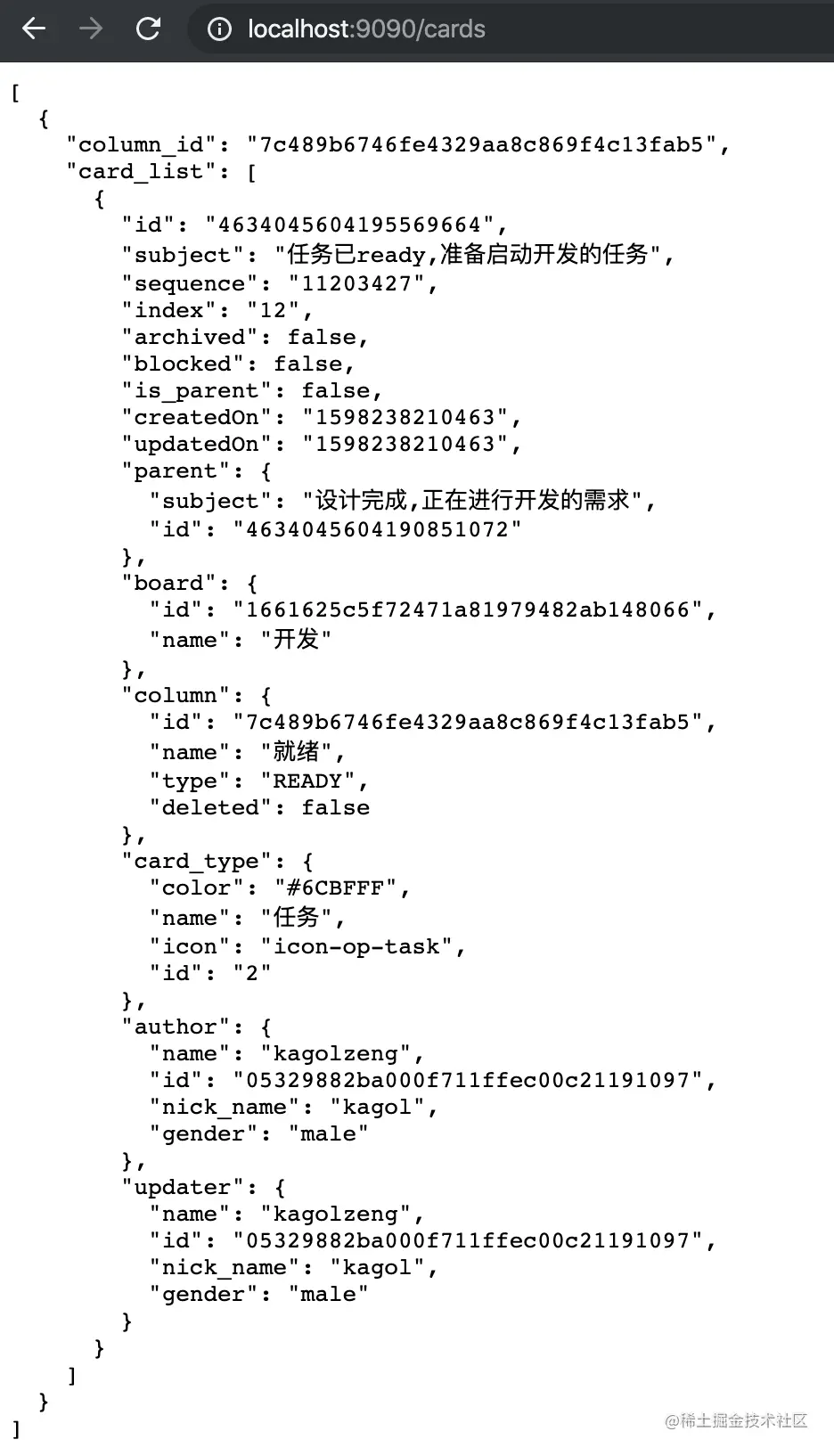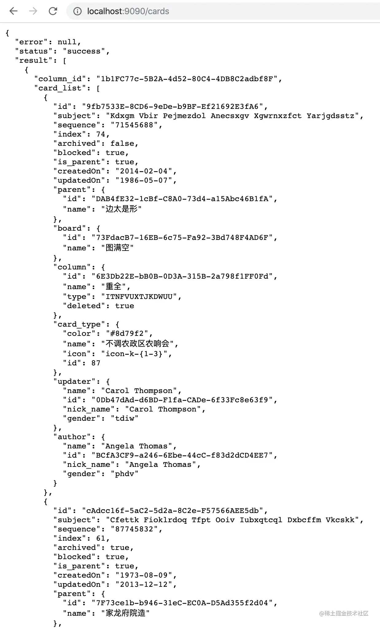 在浏览器地址栏输入:http://localhost:9090/cards,即可查看该接口的返回数据