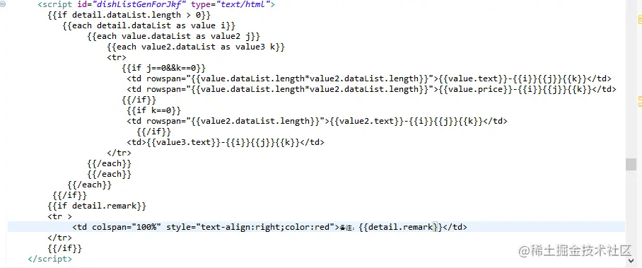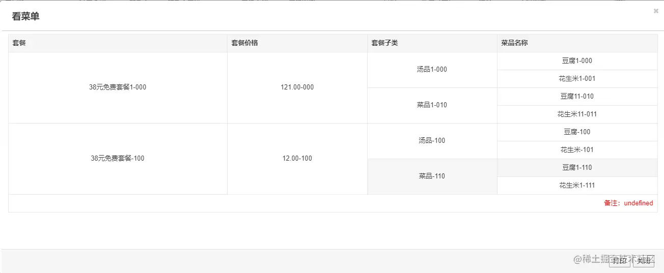 数据: { "detail": { "dataList": [ { "code": 11, "text": "38元免费套餐1", "price": "121.00", "rowspan": 4, "dataList": [ { "id": 11, "text": "汤品1", "dataList": [ { "id": 1, "text": "豆腐1" }, { "id": 2, "text": "花生米1" } ] }, { "id": 2, "text": "菜品1", "dataList": [ { "id": 11, "text": "豆腐11" }, { "id": 12, "text": "花生米11" } ] } ] }, { "code": 1, "text": "38元免费套餐", "price": "12.00", "rowspan": 4, "dataList": [ { "id": 1, "text": "汤品", "dataList": [ { "id": 1, "text": "豆腐" }, { "id": 2, "text": "花生米" } ] }, { "id": 2, "text": "菜品", "dataList": [ { "id": 11, "text": "豆腐1" }, { "id": 12, "text": "花生米1" } ] } ] } ] } }