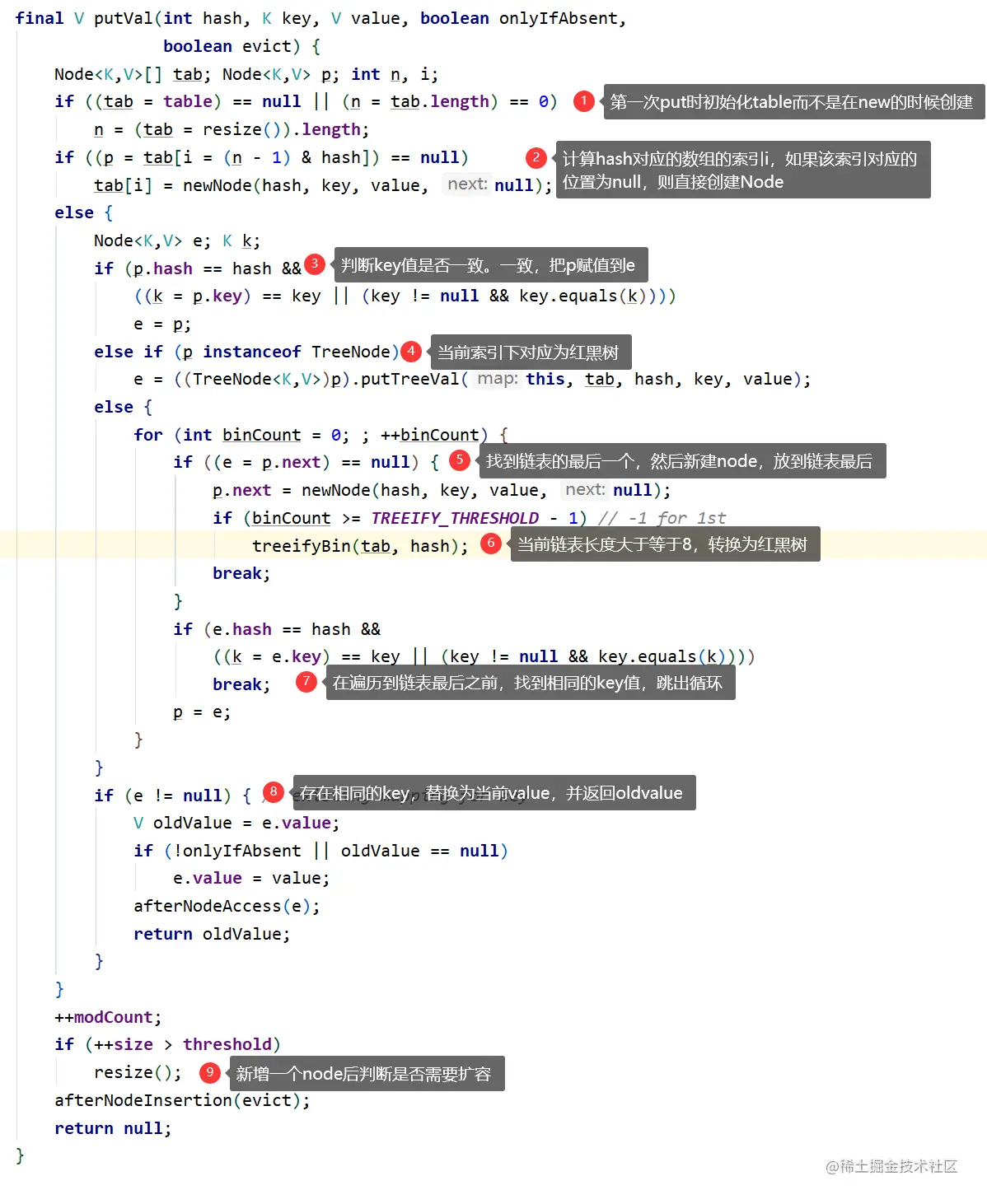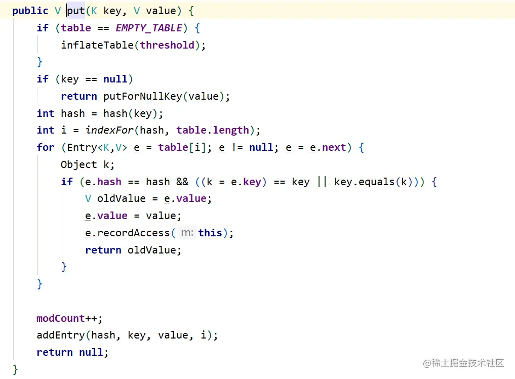 public V put(K key, V value) { return putVal(hash(key), key, value, false, true);}