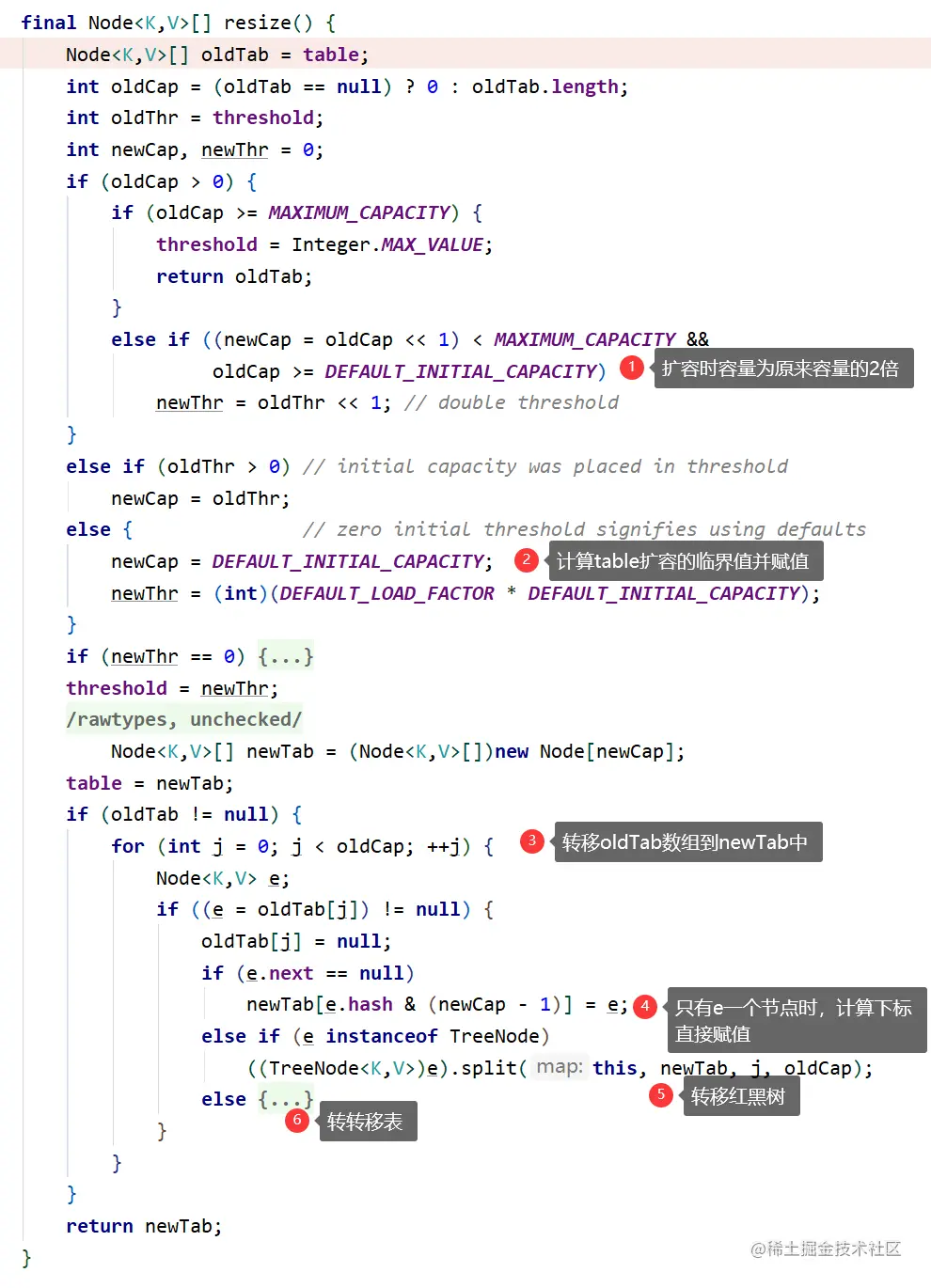 - oldTab不为null时,判断容量是否是最大值,是就让扩容的临界值等于最大值,防止以后调用。不是就扩容为原来容量的2倍。并计算出扩容的临界值。创建newTable,遍历oldTable,转移数据并返回newTable