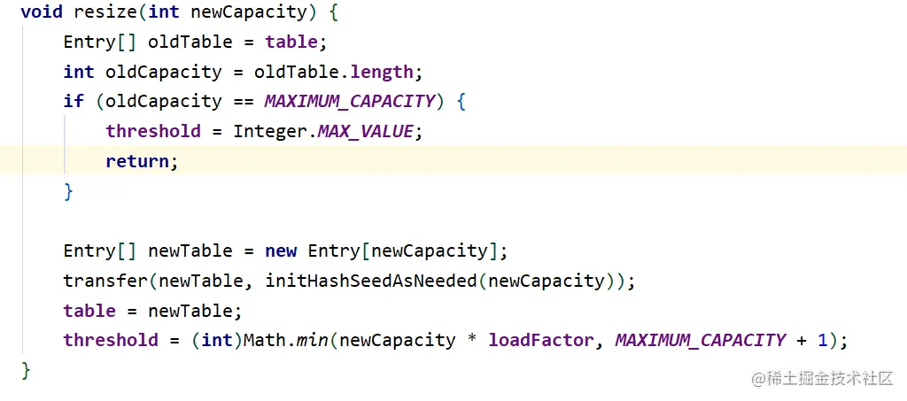 - 如果当前容量是MAXIMUM_CAPACITY,此方法不调整table的大小,但是将阈值设置为Integer.MAX_VALUE。 防止以后调用。