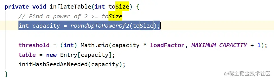 roun dUpToPowerOf2 该方法为找到大于toSize的最小的2的幂数