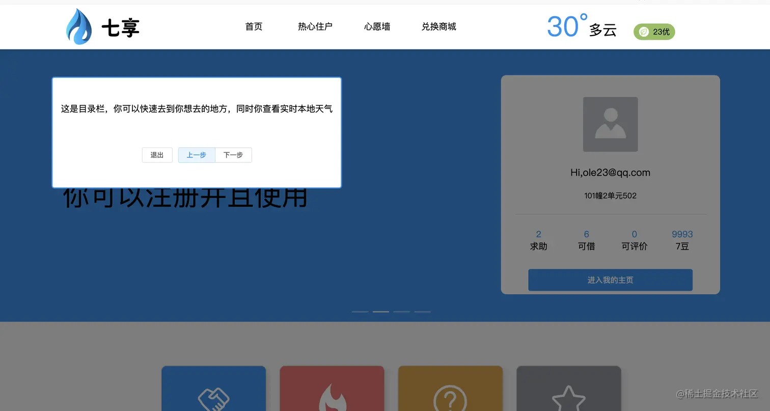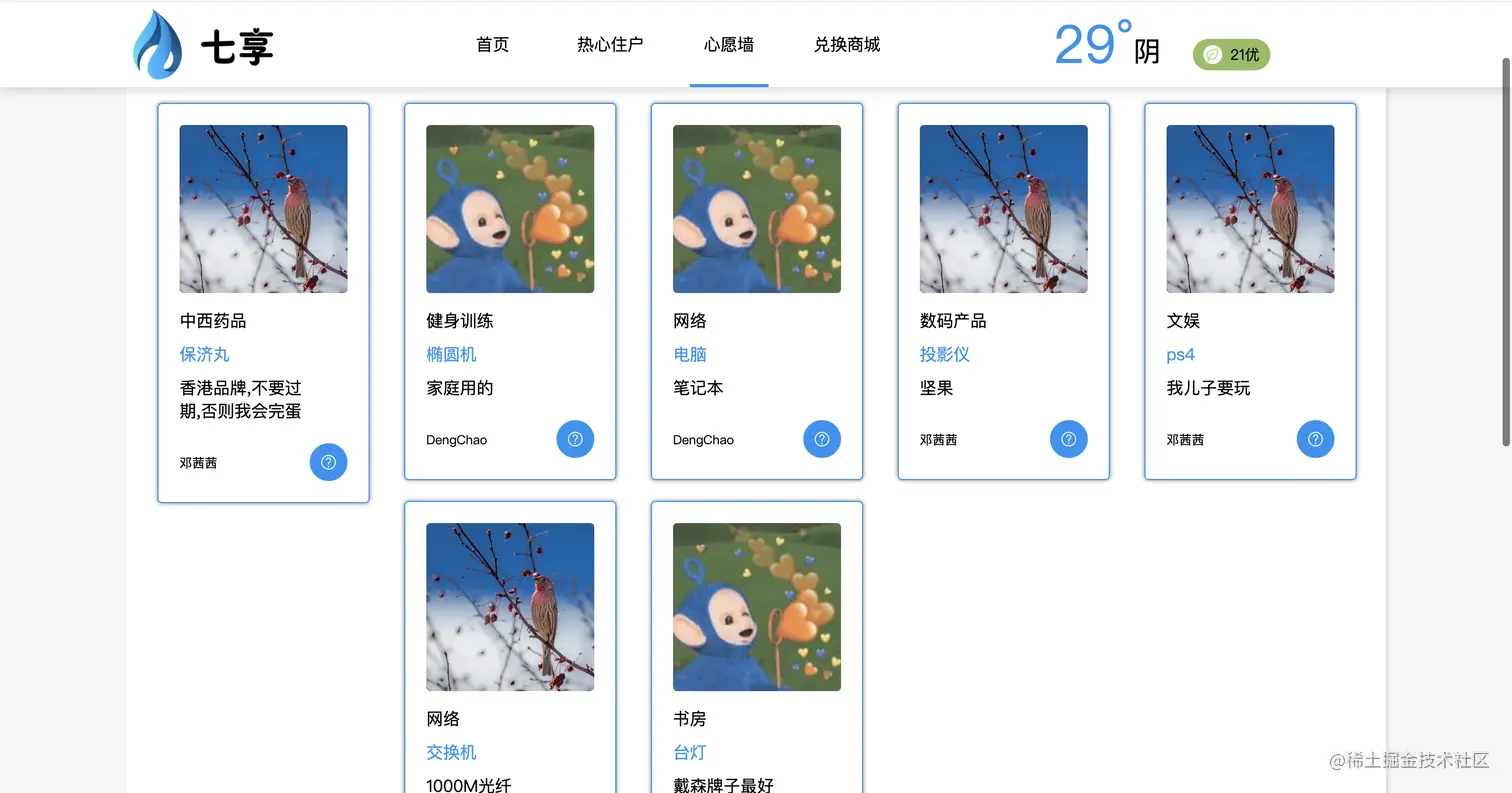 这是一个以小区为单位的业主与业主之间的共享闲置物品的网站,共享者通过共享自己的物品来得到相应的7豆,你们可以用7豆来在网站上兑换到生活用品。 项目我实现了可以在pc端和微信小程序登陆项目,实现数据的共用,但由于本来这项目是个人,由于微信登陆限制,导致pc端无法实现用微信账号登陆。