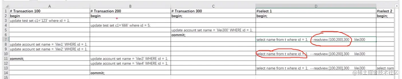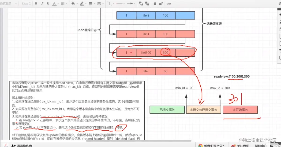 然后依次去找id,如果在数组里的就跳过,然后向下找,直到找到已提交的; 如果比最小的还小,那肯定是可见的,如果比最大的还大,是不可见的