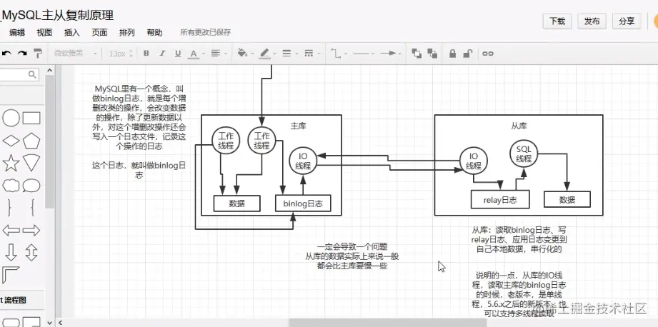写日志的时候,加到binlog日志里,同时开启一个io线程将binlog日志转到从库中,然后从库开启io线程(现在改进为多线程),读取binlog日志后,写到一个relay日志里,然后开启sql线程去读取里面的relay日志,写到本地的数据库里(为什么需要这个relay日志?)