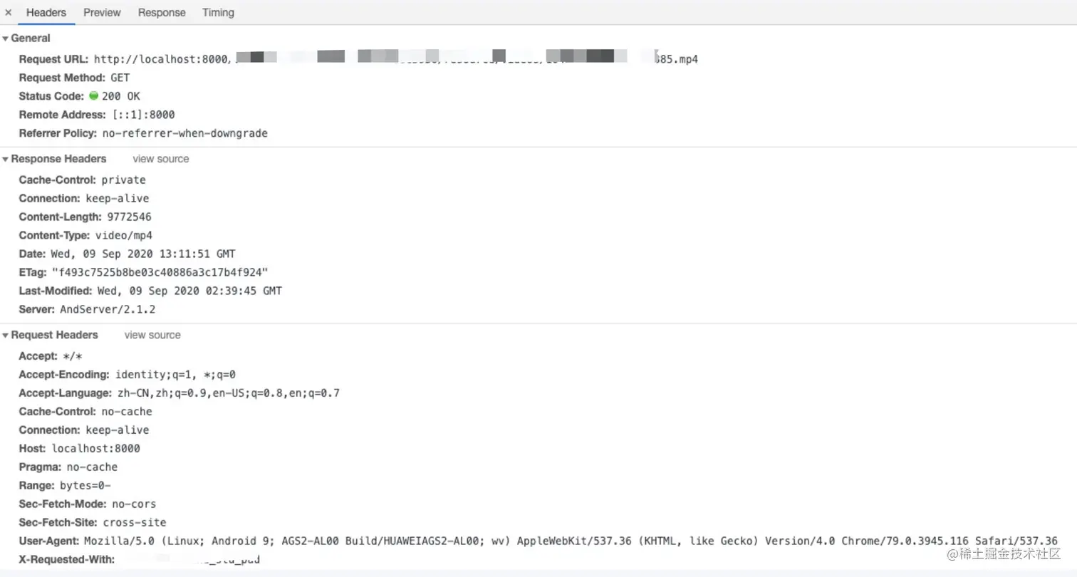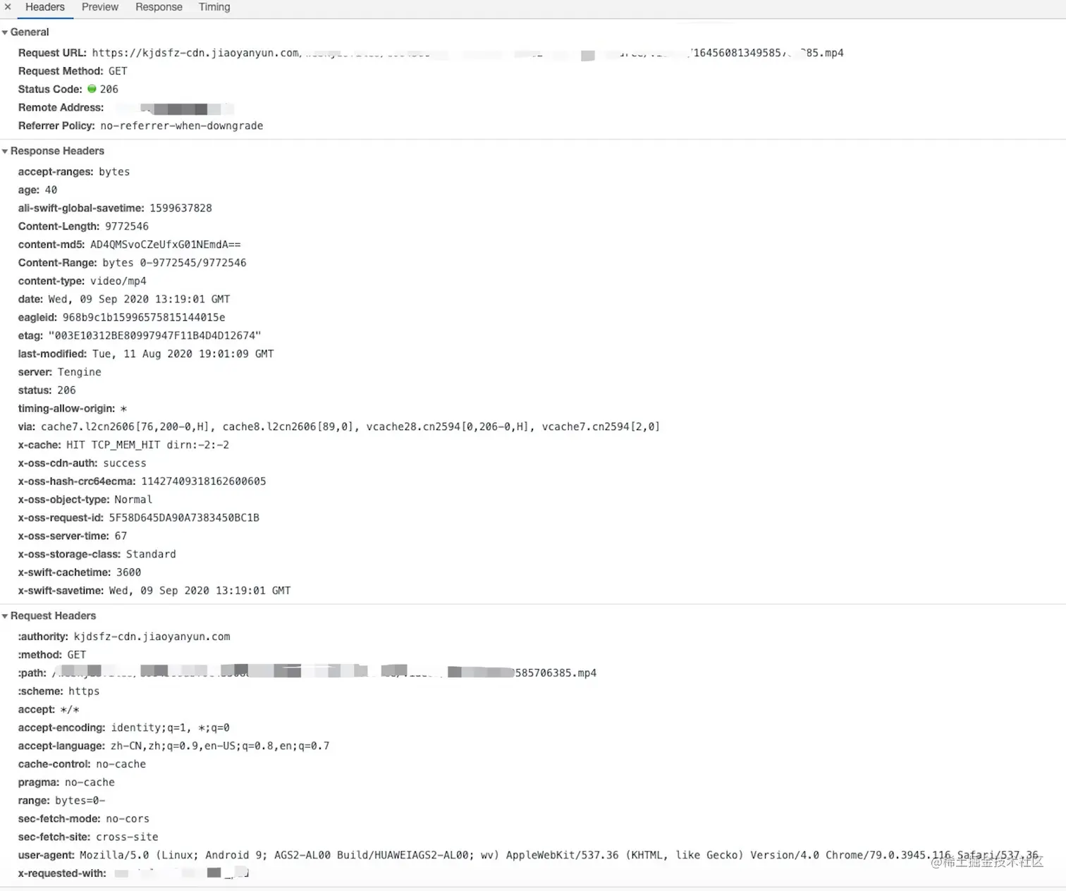 经过排查,我们发现在前端操作逻辑一致,视频一致的情况下,仅app本地视频会出现这个问题。所以,我们近一步的比较了本地视频和云端视频的http协议,发现了不同。