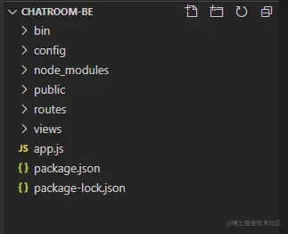这个应用很简单,里面的东西大家通过express的官网学习就可以知道它们大概是干嘛的,可以先不用详细了解,我们之后再来对每一个中间件进行源码分析,我们先用express创建一个简单项目,然后把它改造成一个web聊天室应用,在这个过程中去学习服务器开发。