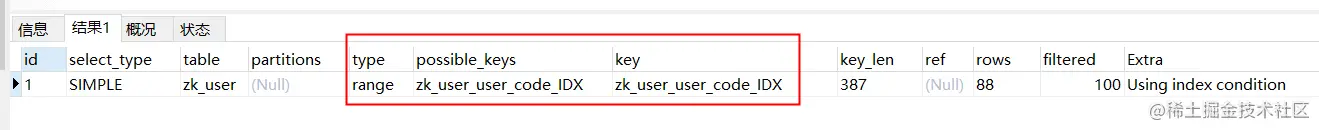 EXPLAIN SELECT USER_CODE,USER_NAME FROM zk_user WHERE USER_CODE LIKE '00270170%'