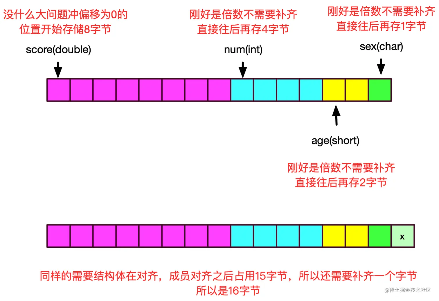 - 在数据完成各自对齐之后,结构体本身也要对齐,结构体的大小要和该结构体内最大元素大小的倍数,不够补齐