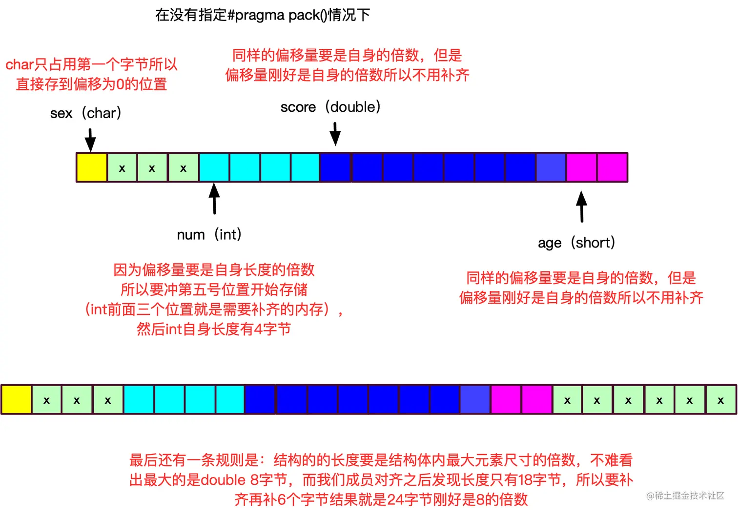 - 每个结构体的成员,第一个成员都位于偏移为0的位置,以后每个数据成员的偏移量min(#pragma pack()指定的数,这个数据成员的自身长度) 的倍数** 一般情况下不指定#pragma pack()默认长度32位系统是4字节,64位系统是8字节**