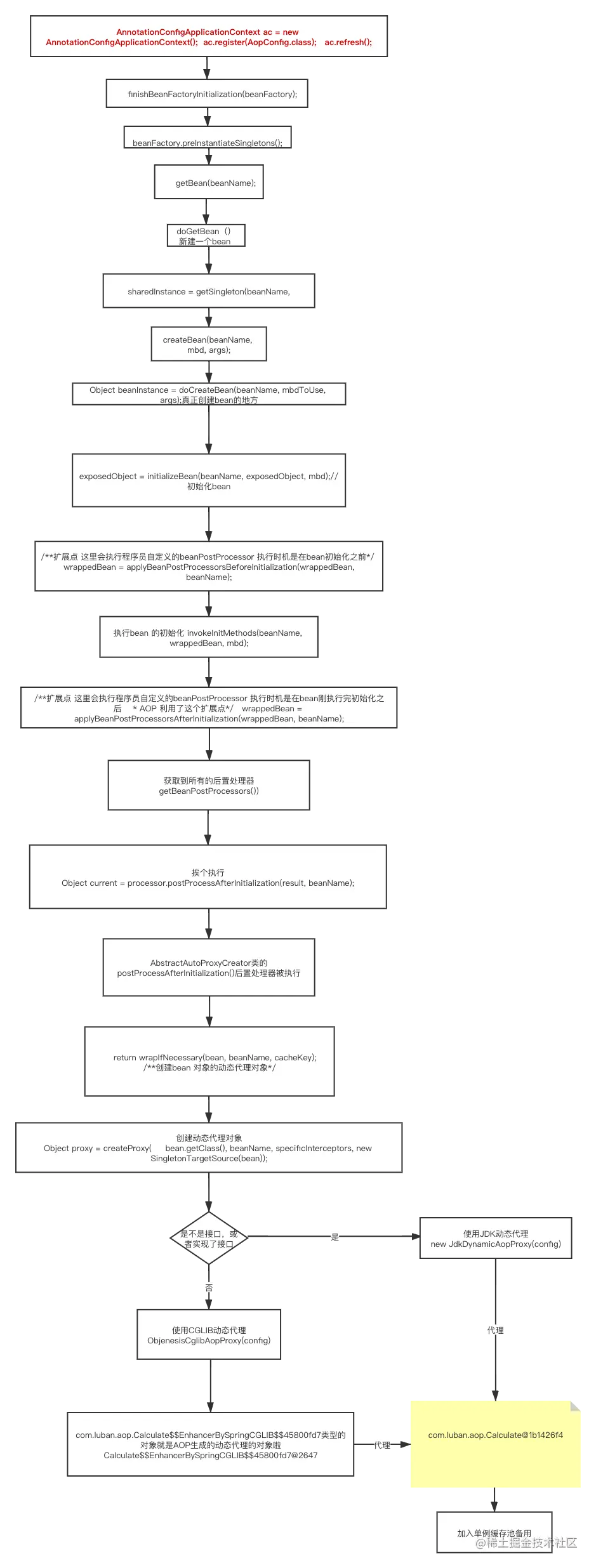 下面的图是AOP生成动态代理对象的过程,生成动态代理对象后放到spring 容器中,用这个动态代理对象替换掉了原本的bean对象。图片上面字有点小 可以放大了看
