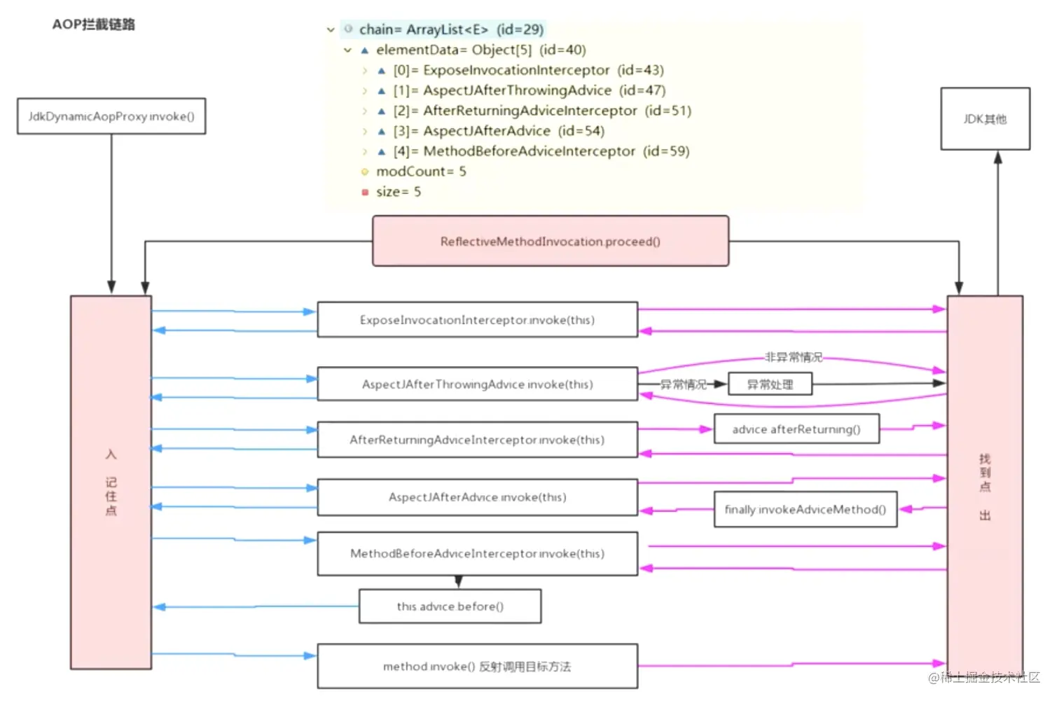 AOP 使用了责任链+递归调用的方式 如下图所示下面6个中1-5是加到了方法上面的通知器,第0个我也不知道是干什么的???希望知道的大佬在评论去说一下