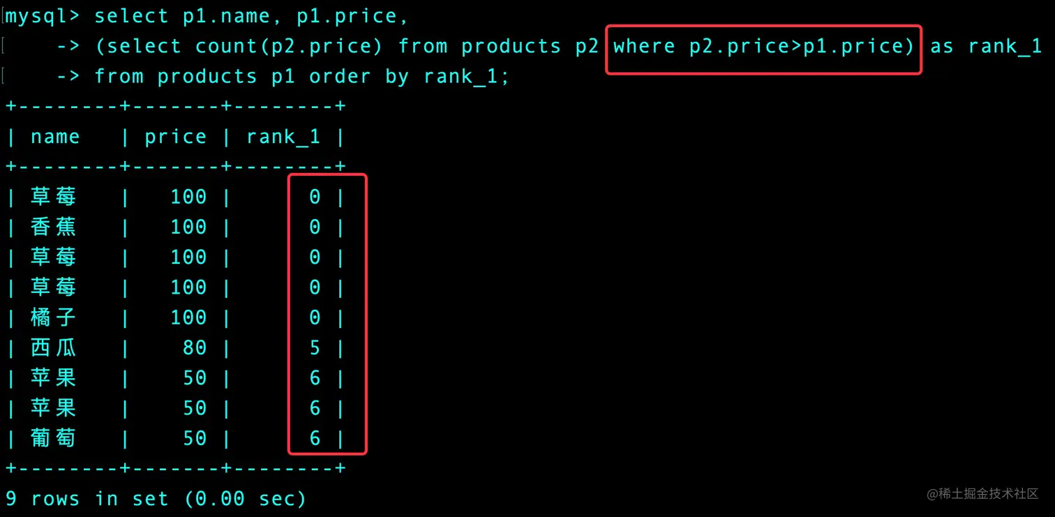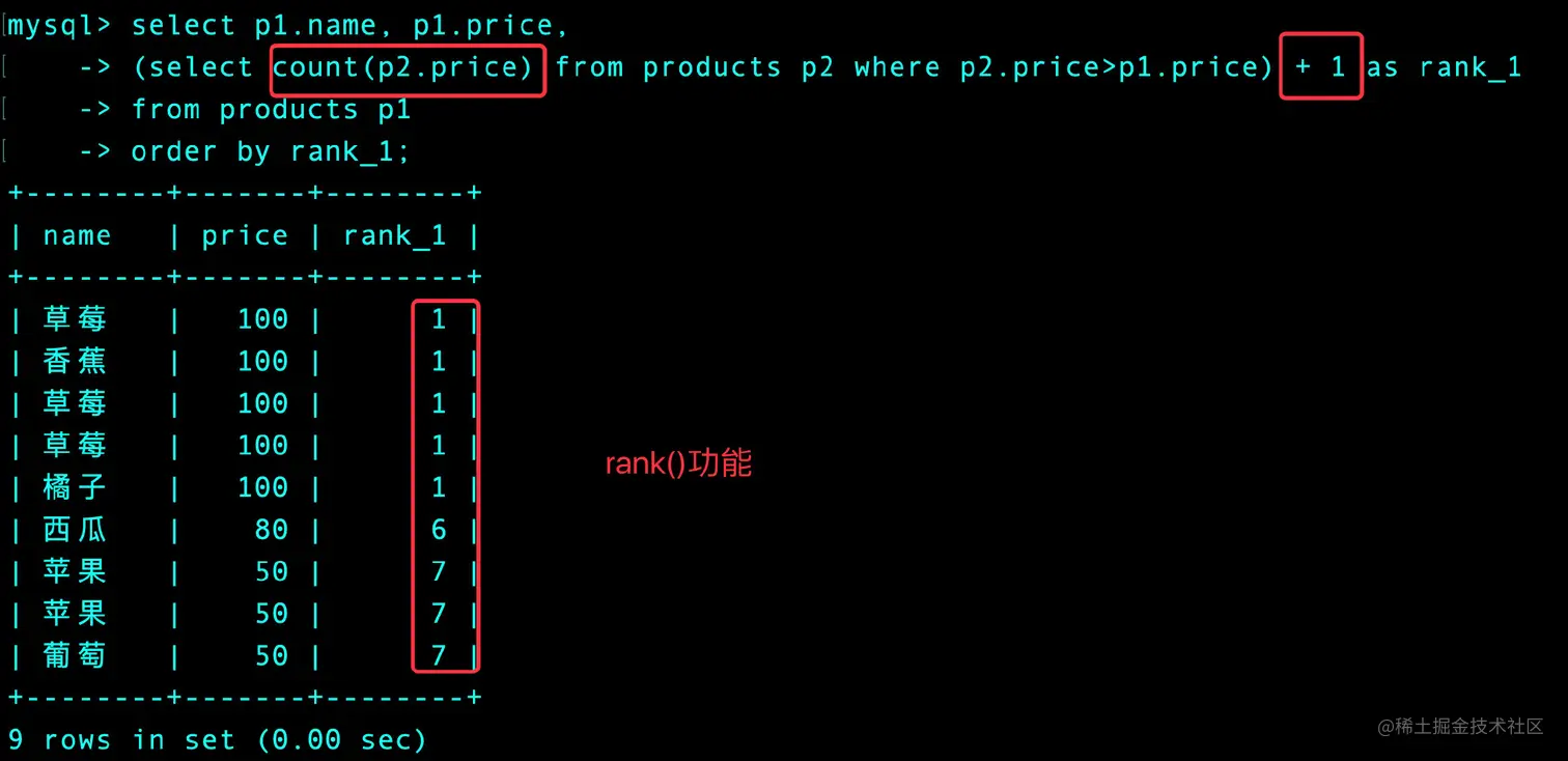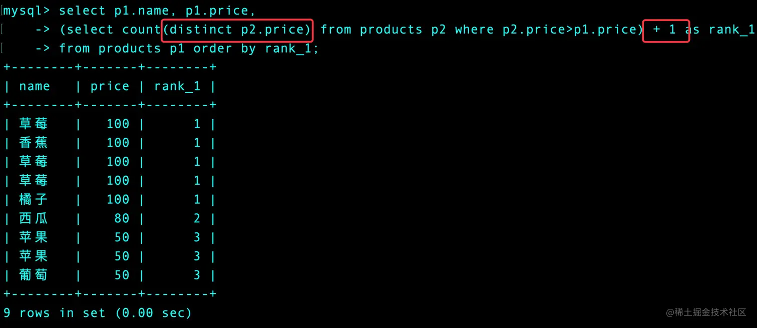 (select count(distinct p2.price) from products p2 where p2.price > p1.price) + 1 as rank_1