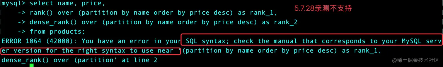 窗口函数只在最新的MySQL版本中才支持的!