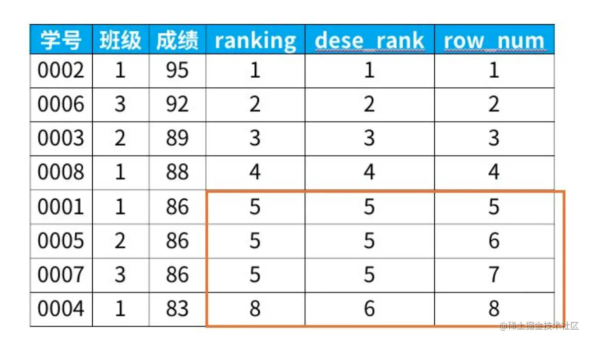 rank()在出现了相同位次之后,跳过了相同的位次dense_rank()则没有跳过相同的位次row_number()按照自然数的顺序进行排列
