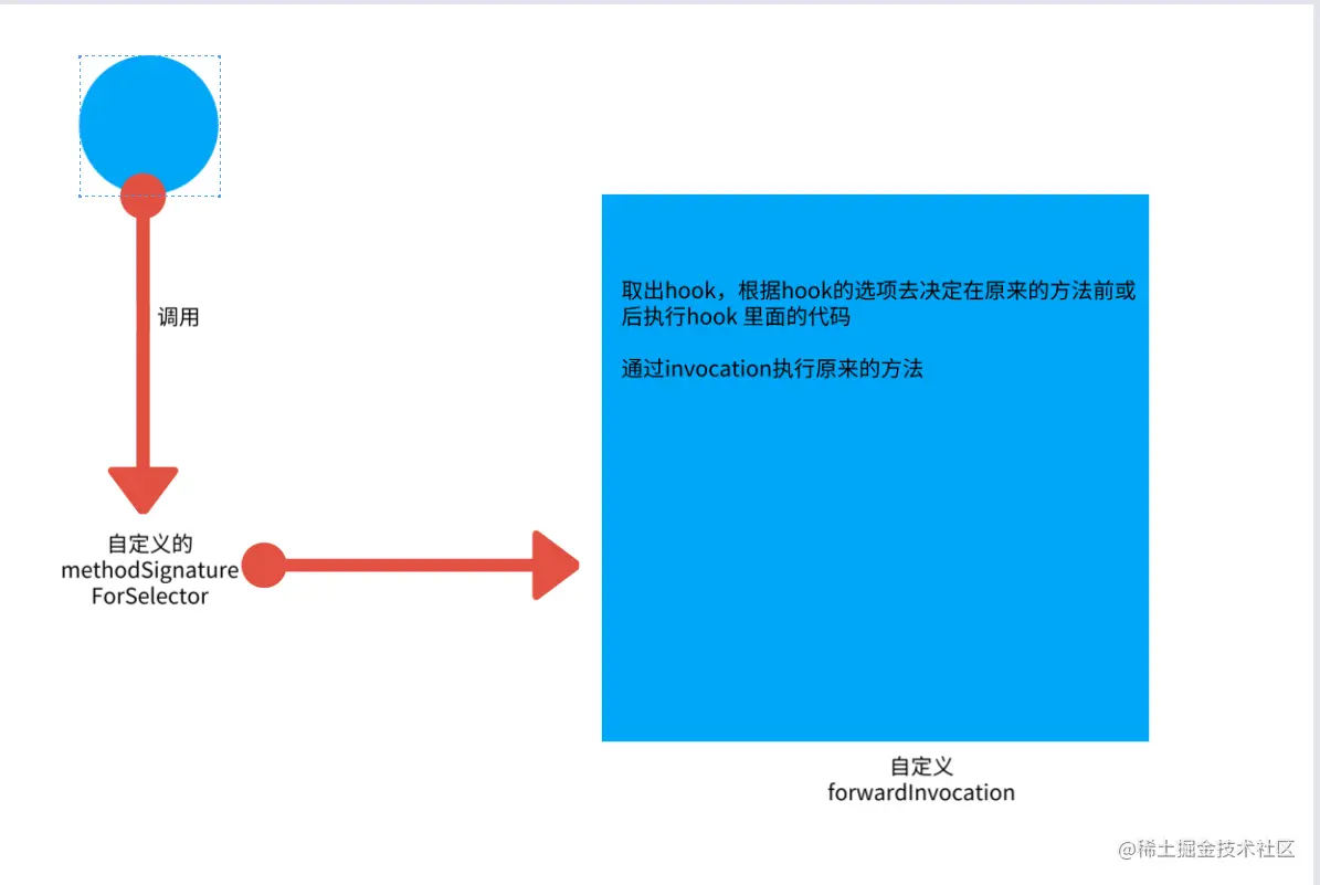 - 在消息转发的流程中,hook类的methodSignatureForSelector和forwardInvocation方法,在forwardInvocation中执行hook的操作