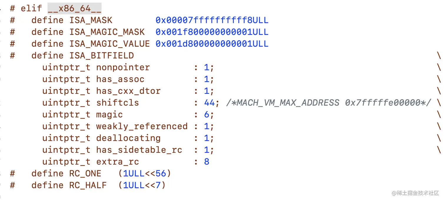 - shiftcls:存储类指针的值。开启指针优化的情况下,在 arm64 架构中有 33 位用来存储类指针;