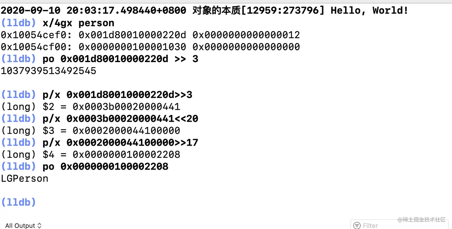 - x/4gx person:以十六进制打印person的4段内存情况,其中0x001d80010000220d为isa指针