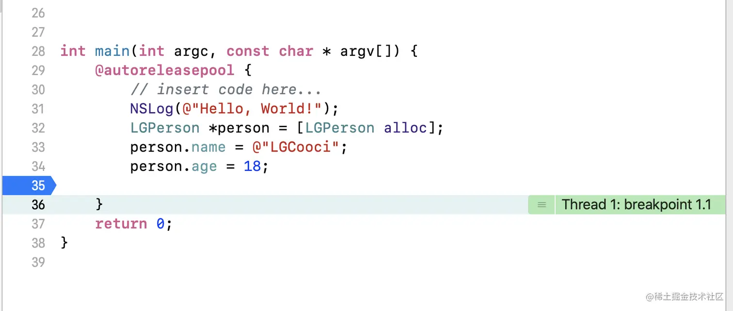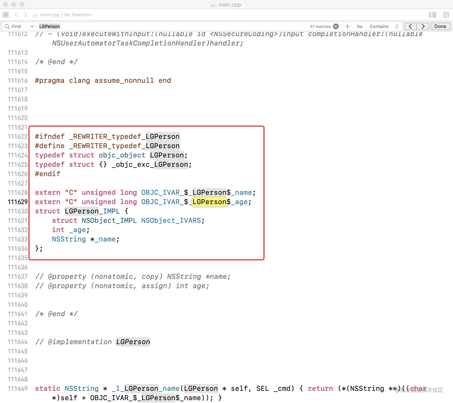 LGPerson继承自NSObject,有name和age两个属性,在其结构体中也得到了体现;NSObject_IMPL就是NSObject编绎后的结构体。