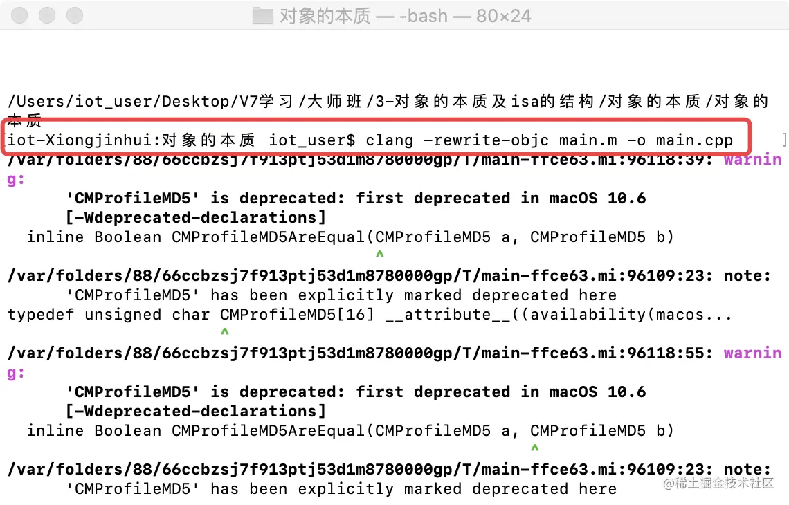 使用 **clang -rewrite-objc main.m -o main.cpp **将main.m文件编绎成main.cpp文件