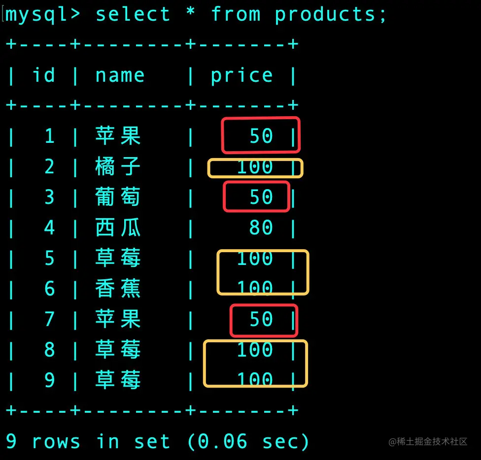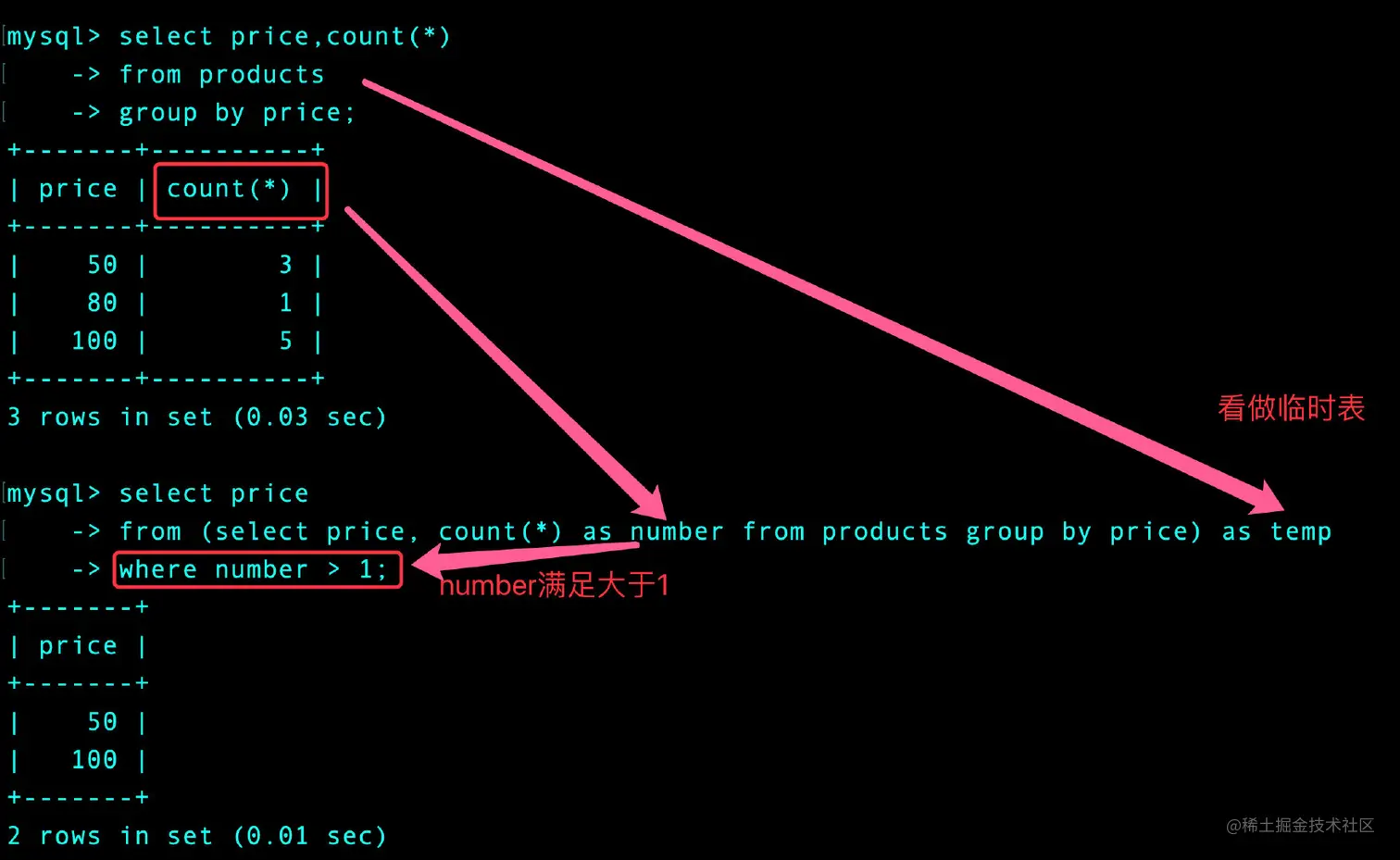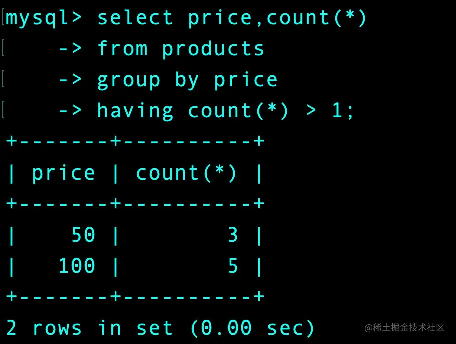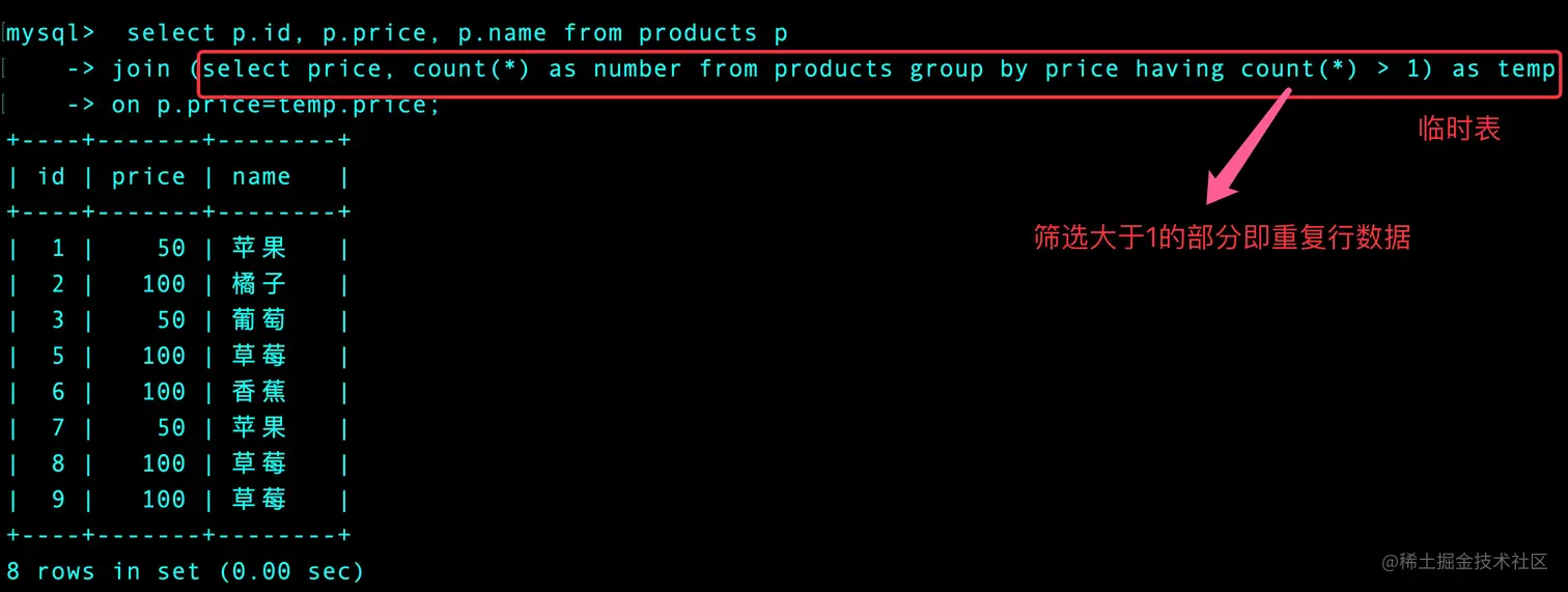 having count(*) > 1) as temp -- 将临时表的price 和 原始表的price进行联结,查询原始表的全部数据