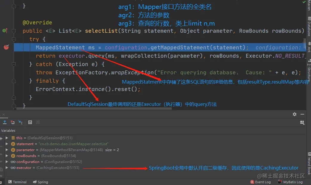 全类名从Mybatis的配置中获取到这条SQL的详细信息,比如paramterType,resultMap等等。 - 既然开启了二级缓存,肯定先要判断这条SQL是否缓存过,因此实际调用的是