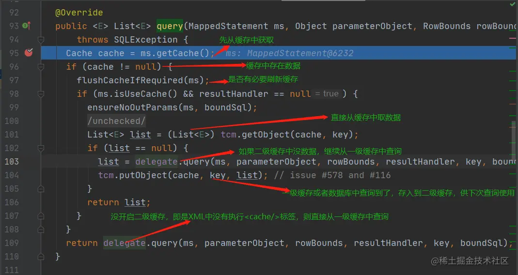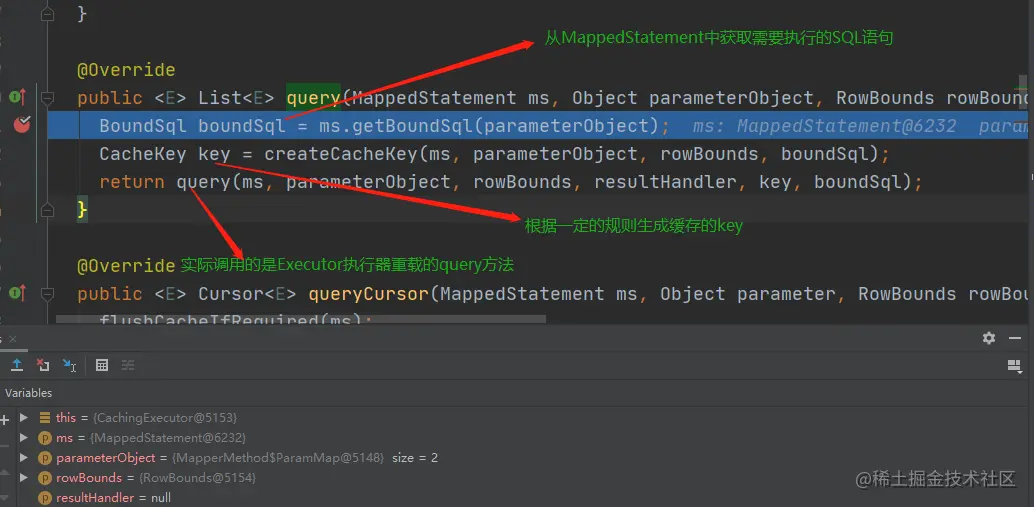 query方法实际做了两件事,实际执行的查询还是其中重载的方法List<E> query(MappedStatement ms, Object parameterObject, RowBounds rowBounds, ResultHandler resultHandler, CacheKey key, BoundSql boundSql),如下图4:根据上图源码的分析,其实CachingExecutor执行的逻辑并不是很难,反倒很容易理解,「具体的逻辑如下」:
