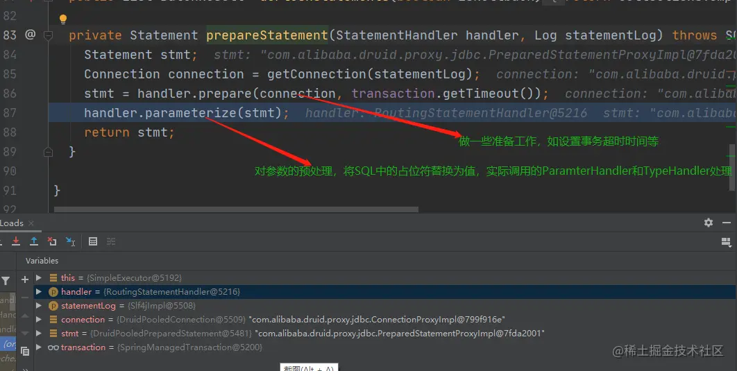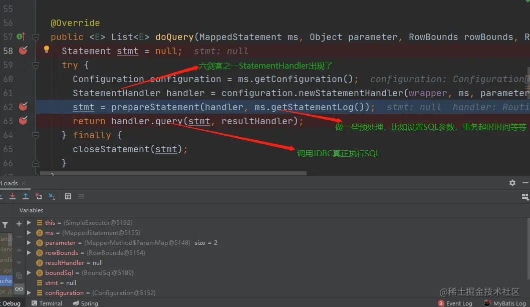#DefaultSqlSession.quer()实际调用的是#CachingExecutor().query(),如果二级缓存中存在直接返回,不存在调用#BaseExecutor.quer()查询一级缓存,如果一级缓存中存在直接返回。不存在调用#SimpleExecutor.doQuery()方法查询数据库。 - 「StatementHandler」: