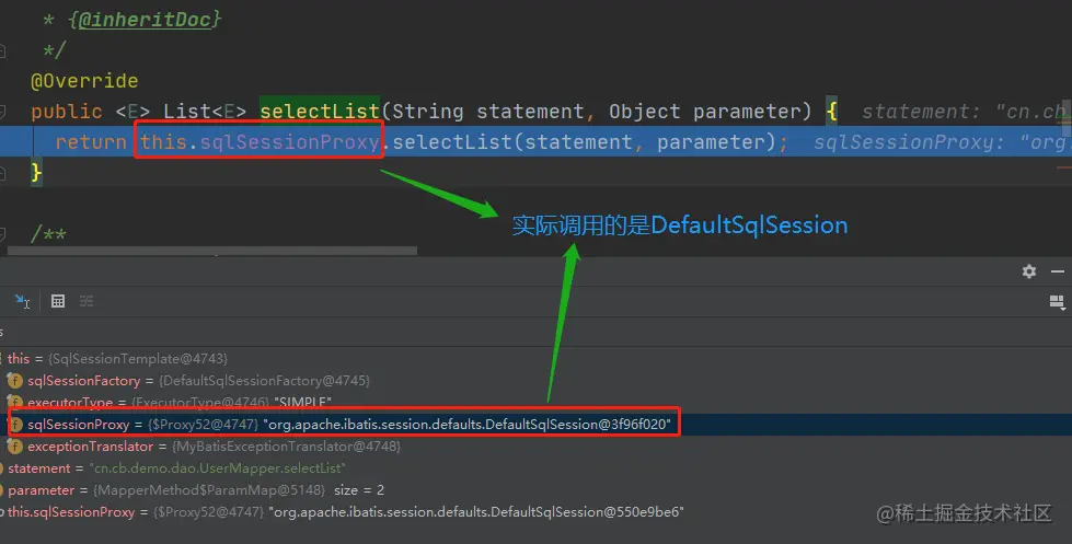 SqlSessionTemplate,因此代码执行到org.mybatis.spring.SqlSessionTemplate#selectList(java.lang.String, java.lang.Object),如图1:从源码可以看到,实际调用的还是
