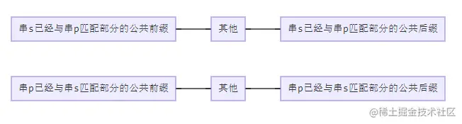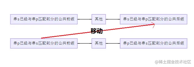 这个时候只要把串p已经匹配部分的前缀和串s已经匹配部分的后缀对齐就可以了,这样就迅速找到了要继续匹配的位置。