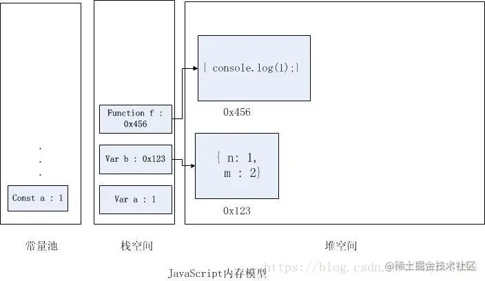 我们存放一个常量时,将其存放在常量池中,保存常量名称和常量的值。在这里主要是说一下栈空间和堆空间。栈空间用来存放全局变量和局部变量,如果该变量是基本数据类型,那么栈空间存储该变量的名称和值。例如,var a = 1; 我们会在栈空间中开辟一块新的内存,存放变量的名称a和变量的值1。如果该变量是复杂数据类型(对象),那么栈空间存放变量名称和该对象在堆空间中的地址值。例如,var b = {n : 1,m : 2}; 我们会在堆空间中开辟一块内存存放对象{n : 1,m : 2},同时在栈中开辟一块内存空间存放变量名b和该对象在堆空间的地址值0x123。