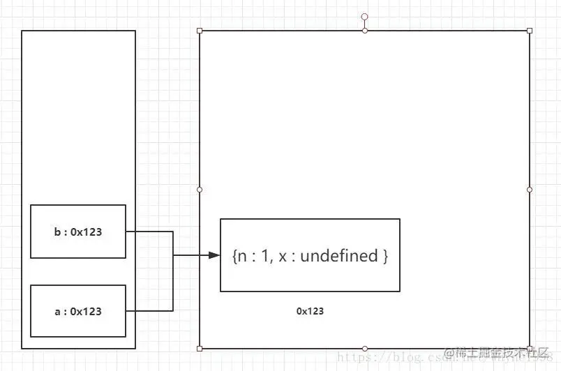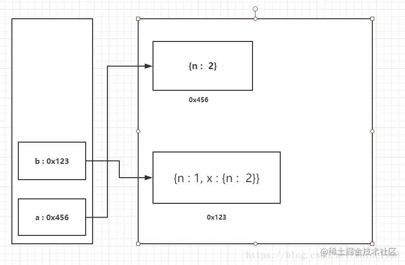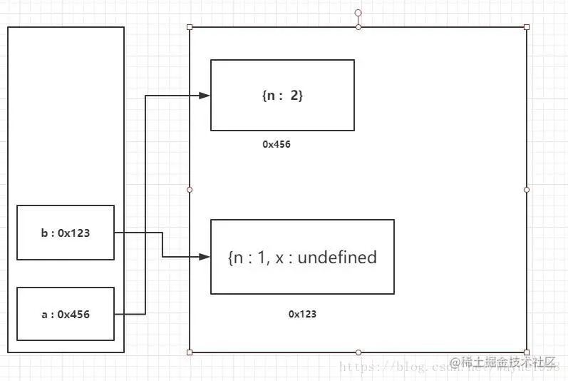 最后,执行a.x=a。需要注意的是,此时左右两边的a并不相同,右边的为新产生的a,其值为0x456,而左边的a由于一直保持着引用,并没有被销毁,所以地址一直是0x123,那么问题就解决了,a.x = a就是把对象b中的属性x的值赋值为{n : 2},到这里为止,问题就解决了。