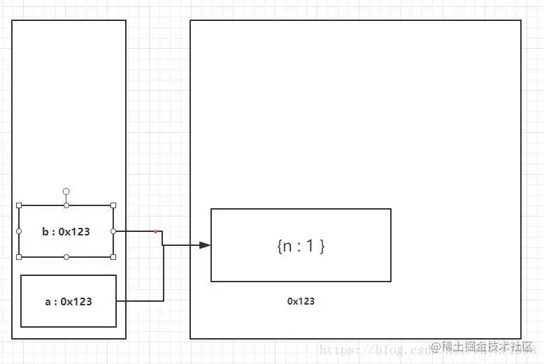 执行第二行时,在栈中新开辟了一块内存空间用来存放b,由b=a可知b和a的保存的地址值相等,均为0x123。这里一定要注意,是将变量a的内容(地址值)赋值给b。此时a和b都指向堆空间中的同一块内存。