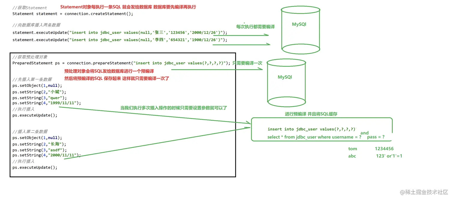 - 可以通过 preStatement 进行预编译处理,通过占位符的形式设置参数,来防止 SQL 注入。