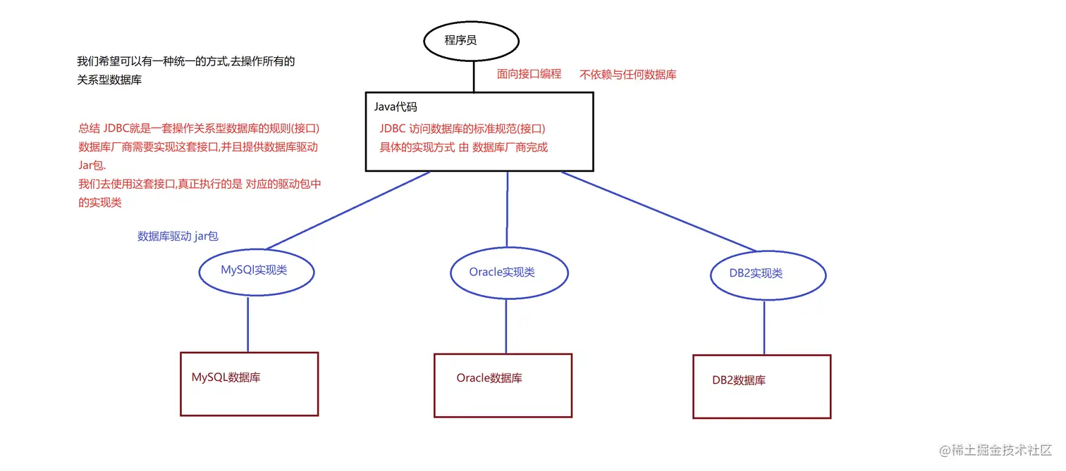 - JDBC 是一套接口,具体的实现类由各数据库厂商提供,具体的实现类封装成 jar 包,这个 jar 包就是数据库驱动。