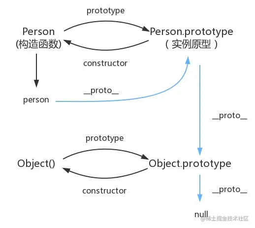 当读取实例的属性时,若查找不到,就会查找与该对象关联的原型中的属性,如仍旧查找不到时,就会去查找原型的原型,直至找到最顶层为止。由于原型也是一个对象,所以原型也可以调用_proto_属性来指向原型的原型。(其实原型对象就是通过 Object 构造函数生成),具体关系如下图所示: