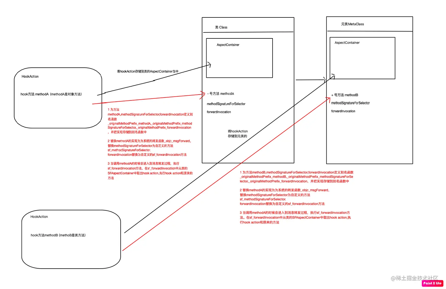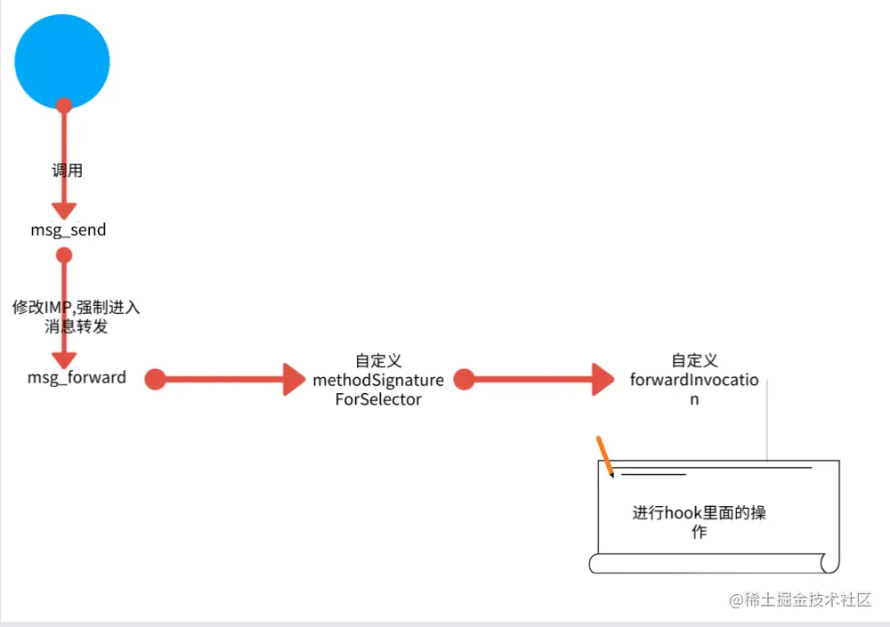 - 对于hook一个对象,是通过动态生成一个子类,再将对象的isa指针指向新建的子类(和KVO的实现方式一致),然后在子类中进行上图的操作