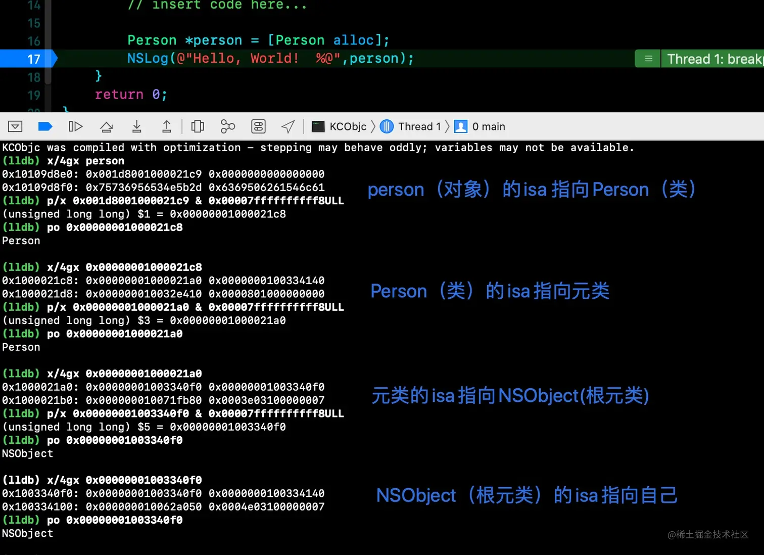 0x00000001000021a0是isa中获取的类信息所指的类的isa的指针地址,即Person类的类的isa指针地址,在Apple中,我们简称Person类的类为元类所以,两个打印都是Person的根本原因就是因为元类导致的。