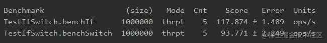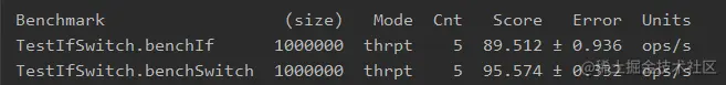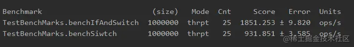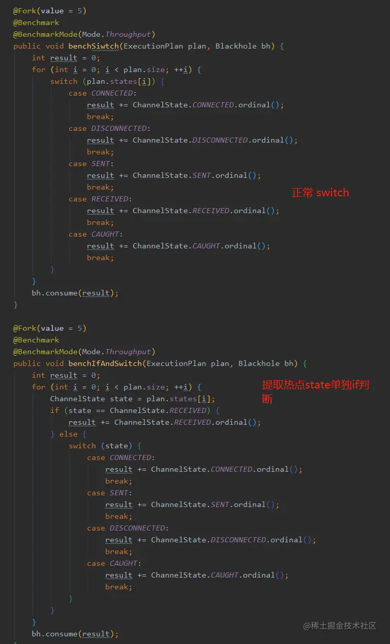 并且还给出了 Benchmark 的代码,就是通过随机生成 100W 个 state,并且 99.99% 是 ChannelState.RECEIVED,然后按照以下两种方式来比一比(这 benchSwitch 官网的例子名字打错了,我一开始没发现后来校对文章才发现)。