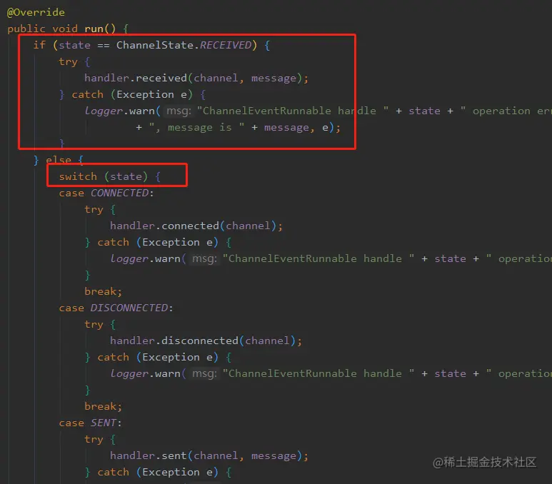 说来也是巧最近在看 Dubbo 源码,然后发现了一处很奇怪的代码,于是就有了这篇文章,让我们来看一下这段代码,它属于 ChannelEventRunnable,这个 runnable 是 Dubbo IO 线程创建,将此任务扔到业务线程池中处理。