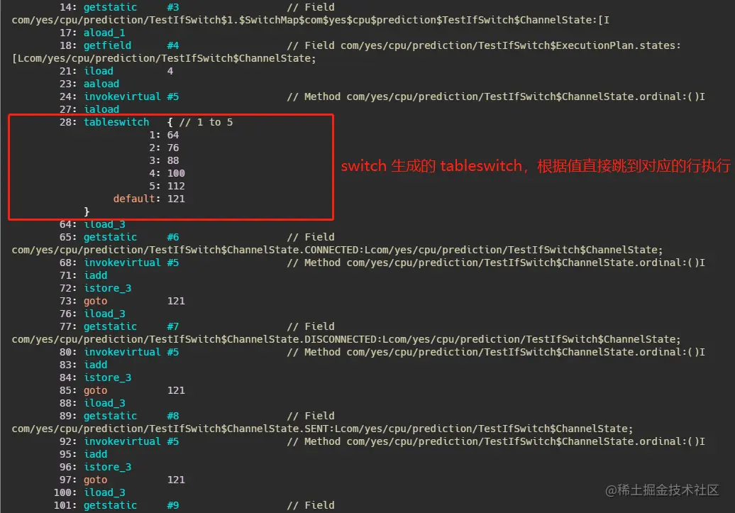 也就是说 switch 生成了一个 tableswitch,上面的 getstatic 拿到值之后可以根据索引直接查这个 table,然后跳转到对应的行执行即可,也就是时间复杂度是 O(1)。