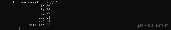 关于 switch 还有一些小细节,当 swtich 内的值不连续且差距很大的时候,生成的是 lookupswitch,按网上的说法是二分法进行查询(我没去验证过),时间复杂度是 O(logn),不是根据索引直接能找到了,我看生成的 lookup 的样子应该就是二分了,因为按值大小排序了。