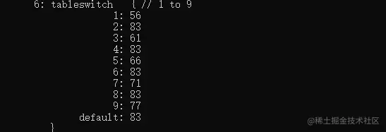 还有当 switch 里面的值不连续但是差距比较小的时候,还是会生成 tableswtich 不过填充了一些值,比如这个例子我 switch 里面的值就 1、3、5、7、9,它自动填充了2、4、6、8 都指到 default 所跳的行。