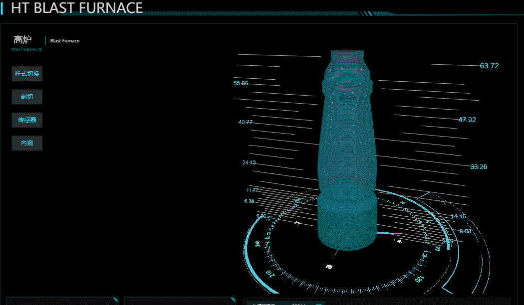 2D 面板上呈现了高炉的基本信息,热传感器信息,高炉检测信息;3D 可视化场景中呈现了高炉的真实几何结构,采用三维热力图呈现了高炉各个关键位置的温度信息,底部方位指针定位了高炉的朝向和传感器位置,两侧的高度标识展示了炉体关键位置高度信息。